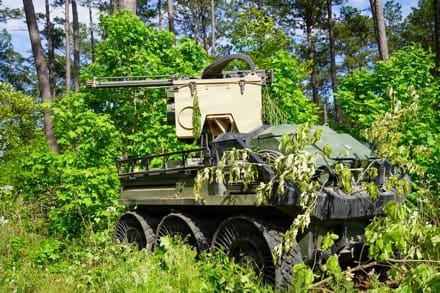 Photo above: A Hunter Wolf unmanned ground vehicle assigned to Charlie Battery, 3rd Battalion, 320th Field Artillery Regiment, 3rd Mobile Brigade, 101st Airborne Division (Air Assault), holds a steady overwatch position with a mounted remote operated .50-caliber machine gun during a combat simulation exercise at the Joint Readiness Training Center, Fort Polk, Louisiana, April 13, 2026. (US Army photo by MSG Anthony Hewitt)