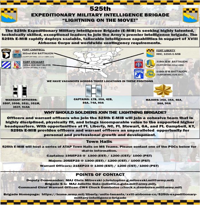 We are looking for Warrant Officers, Captains, and Majors that want to serve in the XVIII Airborne Corps and in the Army’s premiere Expeditionary Military Intelligence Brigade.